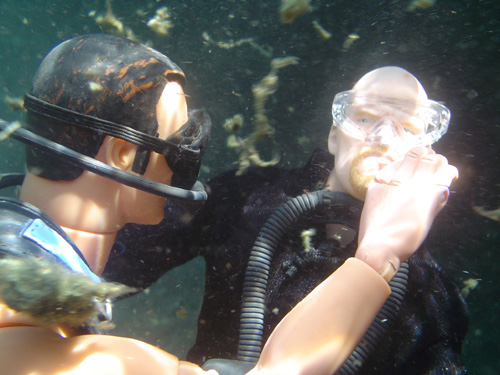 If my plan was going to be successful, it needed to be executed fast. But from the start things weren’t looking up for us. As soon as Roy and I arrived at Base Camp, we noticed that we only had one rebreather and suit available in the shed. To make things worse, one of the rebreather’s twin hoses had been cut off. Ivanov had thought of everything. Bits and pieces of equipment were scattered on the floor. In one corner, a single-hose open-circuit scuba set was missing its primary regulator; its air cylinder had 1/3 of its oxygen capacity. - Alright, Roy! We gotta make this work somehow. You take the rebreather and the suit. See if you can reattach the hose to the counterlung. I’ll take the scuba set. I’ll use the cylinder’s main valve to control my oxygen supply. It should work fine - I told Roy, who didn’t waste any time. He cut a hole in the rebreather’s case, carefully watching for the scrubber which contains the carbon dioxide absorbent. He then reinserted one of the hoses back in the counterlung, securing it with a broken diving mask strap. - That is ingenious, Roy! - I told him thrilled. He looked at me, smirked and said: - When you’re born poor like I was, you learn how to fix things with what’s around you! Are you ready, Johnny? - he asked me. - As ready as I will ever be! - I replied. We got back to the Jeep and headed back to the pond. On our way there, I radioed Captain MacAlister: - The toads are ready. Release the conductor. I repeat… release the conductor, over and out - We parked the vehicle a few yards away from the command post, staying out of Dr. Johnson’s sight. Sgt. Nash, our bogus helicopter pilot, could be seen on the other side of the pond. He walked slowly by the shore, heading towards the helicopter. - Let’s get moving, we need to take their diver down first, then reach the other side in no time - I told Roy, who was already geared up. He agreed. We then slid down to the water. Roy got in first. He checked for leaks in the twin hoses of his rebreather and disappeared underwater. Following him, I opened my oxygen cylinder’s valve slowly, letting out just enough oxygen for small gulps of air. I checked my goggles and plunged into the pond. Something wasn't right. An eerie feeling crept over me while sinking in the water. The water temperature felt pretty good, though. Visibility wasn’t bad either. Not far from our position, I could see one of the several toxic waste barrels that littered the bottom of the pond. I adjusted my mouth piece and waved at Roy, signaling our course of action. I took another breath of compressed air and took off swimming towards Dr. Johnson and the raft. I swam close to the surface, keeping an eye on Ivanov’s diver. I didn’t want to be caught by surprise. It didn’t take long for us to reach the middle of the pond. I floated up once again, and peeked at the raft. Dr. Johnson was still there, unsuspicious of our presence. I submerged, and told Roy to get moving to the other end of the pond. I had to take care of the burly diver. If I didn’t succeed at least one of us would be there when they unloaded the missile off the raft. While Roy swam away, I got closer to the rubber boat. I had to succeed. I had to avoid getting hurt and I had to accomplish my mission leaving no room for Dr. Johnson to complete his. I also had to manage to do it fast, considering that I didn’t have enough oxygen to waste, or else I was looking to spend eternity at the bottom of the Mulberry Ridge Pond. I came from behind, gliding underwater like a dart. I pulled him underwater by the leg, clutching to him and praying to the gods that his grip around the raft would come loose. It did. We plummeted to the bottom slowly, wrestling against the burdensome water. Almost instantly, I watched Dr. Johnson taking off, paddling the raft towards the helicopter. I failed to grab my knife several times during the fight. Ivanov’s diver was a strong man and even though he wasn't using his rebreather, my efforts to eliminate him were scarcely effective. At some point I managed to grab his chin and attempted popping his neck up; a maneuver that back-fired when he turned his body around and shoved me against a wall of underwater foliage. I was choking on water. I was considering evasive action when out of nowhere Roy appeared, like a mirage through the cloud of algae and sand. He grabbed the husky diver by the head and managed to pull off his scuba goggles. Unable to breathe and see properly, the husky diver slowly became incapable to fight Roy and soon water filled his lungs. He stopped moving: dead! Noticing that Roy had finished the adversary, I immediately headed for the surface gasping for air. I spit out my mouth piece and vigorously sucked air in. I felt dizzy for a second, but the sight of Dr. Johnson getting closer to the shore put me back in the water, making me swim even faster than before. To make things worse, Sgt. Nash had finally reached the helicopter and was being held at gun point by Ivanov’s men. We had wasted a lot of time and my plan was about to fail. I kept swimming, hoping that by some supernatural reason, I would reach the shore before the Doctor. But I never made it in time. Dr. Johnson had reached the west banks of the pond and had already started to unload the missile. I was still several yards away from shallow waters. Roy was right behind me, still swimming strong. My mind was swept by the feeling of failure. I was out of breath and my legs showed signs of cramping. The chances of Roy and I launching an attack at the shore were gone. What now? I thought. I had succumbed to the stress of the moment and my mind went simply numb, unable to process a thing. And then the most amazing thing happened. I had come to the conclusion that the most unbelievable of events usually happen out of desperation. Some may call it a miracle.